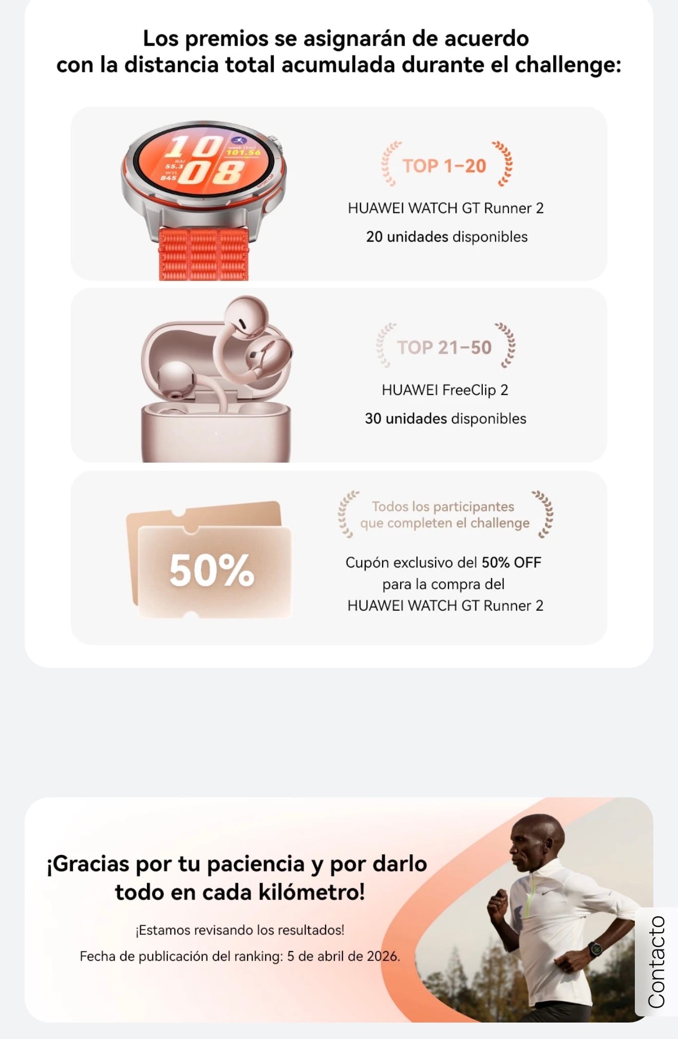 - Todos los participantes que completen los 100K: Desbloquearán un exclusivo cupón del 50% de descuento para la compra online del HUAWEI WATCH GT Runner 2.