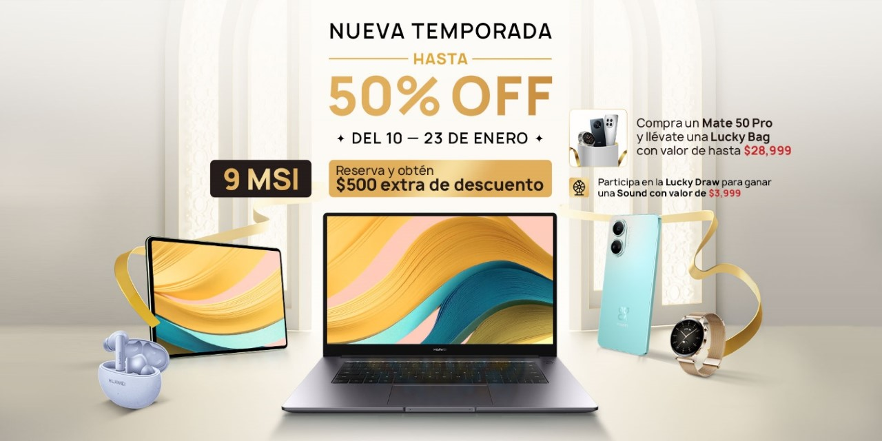 Del 10 al 23 de enero, a través de Huawei eShop, así como en tiendas físicas Huawei Experience Store, los usuarios tendrán la oportunidad de adquirir al mejor precio algunos de los más recientes e innovadores productos de Huawei con descuentos de hasta el 50%, pagos a 9 MSI, cupones de descuento y muchos regalos más.