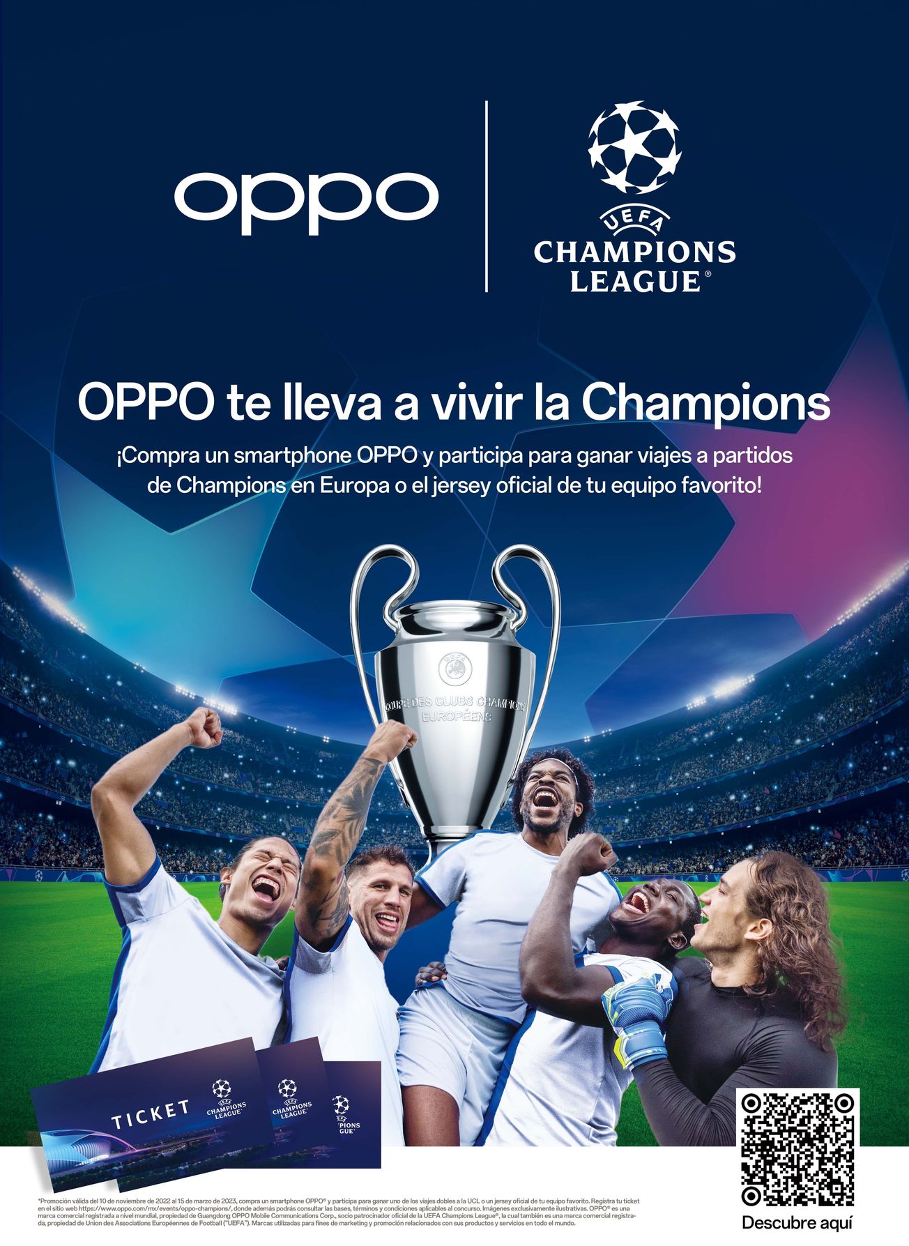 Bajo la propuesta de marca Inspiration Ahead, OPPO motiva a las personas a vivir y compartir la pasión del bello deporte al ser orgulloso patrocinador de la UEFA Champions League. Ahora con una campaña en la que los fanáticos del fútbol podrán participar para tener la oportunidad de ver uno de los partidos más competitivos de Europa. Los más hábiles ganarán uno de los 10 viajes dobles que incluyen vuelo de ida y vuelta y dos noches de alojamiento, además de entradas para un partido de las últimas fases de la UEFA Champions League 2022-23.