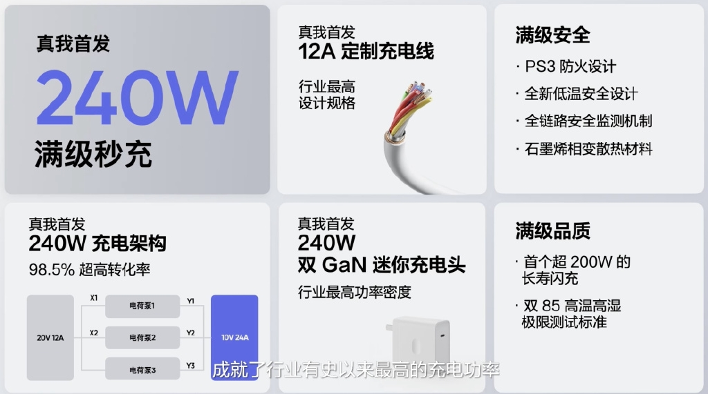 La tercera tecnología es el primer minicargador GaN dual de 240 W del mundo, que cuenta con la mayor densidad de potencia del sector, 2,34 W/CC. Este cargador es compatible con diversos protocolos, como SuperVOOC de 240 W, PD de 65 W, QC y VOOC, y es capaz de cargar rápidamente tabletas, portátiles y otros dispositivos. Cabe destacar que este cargador también es más eficiente que su predecesor, con un aumento de volumen de sólo el 5% pero un aumento de potencia del 60%.