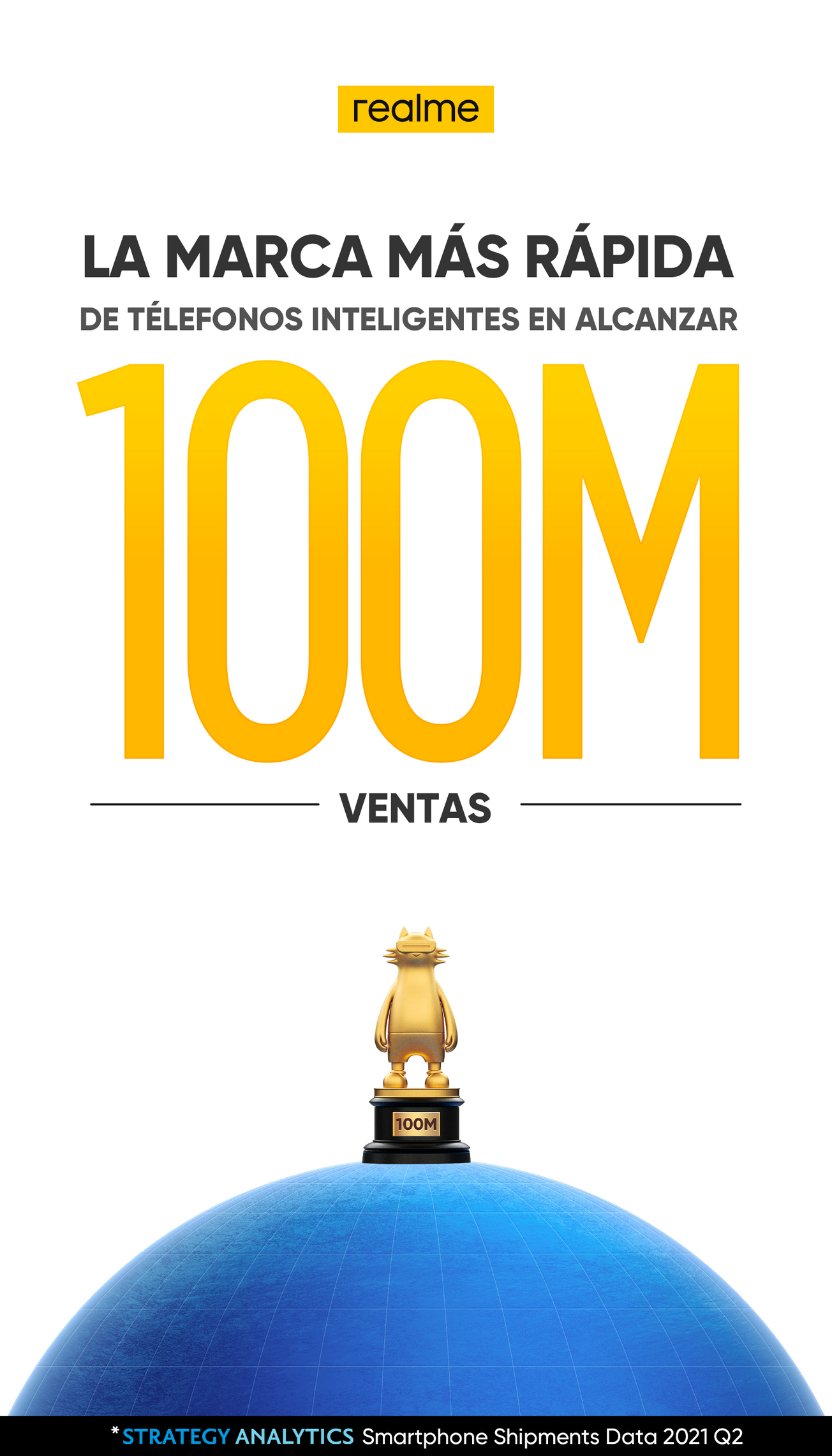 Realme, anunció hoy un logro de 100 millones de teléfonos inteligentes vendidos a nivel mundial. Gracias al sólido desempeño durante los desafíos económicos vividos en 2020 y 2021 debido al pandemia de COVID-19, realme se convirtió en la marca global de teléfonos inteligentes más rápida en alcanzar este logra en tan sólo tres años, según Strategy Analytics,, una consultora de investigación de mercado. realme es también la principal marca de teléfonos inteligentes de más rápido crecimiento a nivel mundial en el segundo trimestre de 2021 con una tasa de crecimiento interanual del 149%, como lo mostraron los datos de la firma de investigación International Data Corporation (IDC).