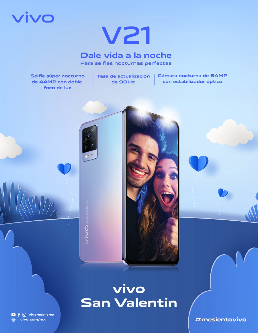 ¿No podrán verse este San Valentín? Entonces es momento de armar una cenita virtual con tu pareja o amigos. Pidan algo rico de comer, busquen un rincón cómodo en su casa y tengan una videollamada nítida con ayuda de vivo. Las cámaras frontales de los equipos de vivo Y53s y Y33, de 16MP, capturan video HD para que aprecies con claridad a tu ser querido, mientras que vivo V21 tiene una impresionante cámara selfie de 44MP con doble foco de luz así no te perderás ni un detalle de su sonrisa.