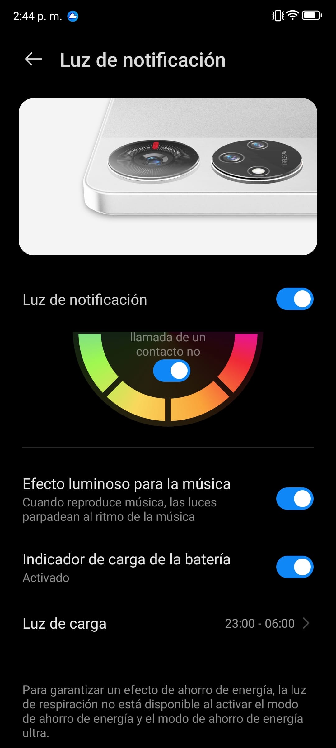 Una opción que personalmente me gusto mucho es la “luz de notificaciones” que nos permite tener una luz justo en el módulo de cámara al momento de recibir alguna notificación . Esta opción cuenta con diferentes parámetros para que el usuario pueda tener una buena cantidad de opciones para jugar. Esta luz puede cambiar de color al igual que tenemos diferentes opciones para que no solamente ver esta luz prender al moretón de recibir una notificación.